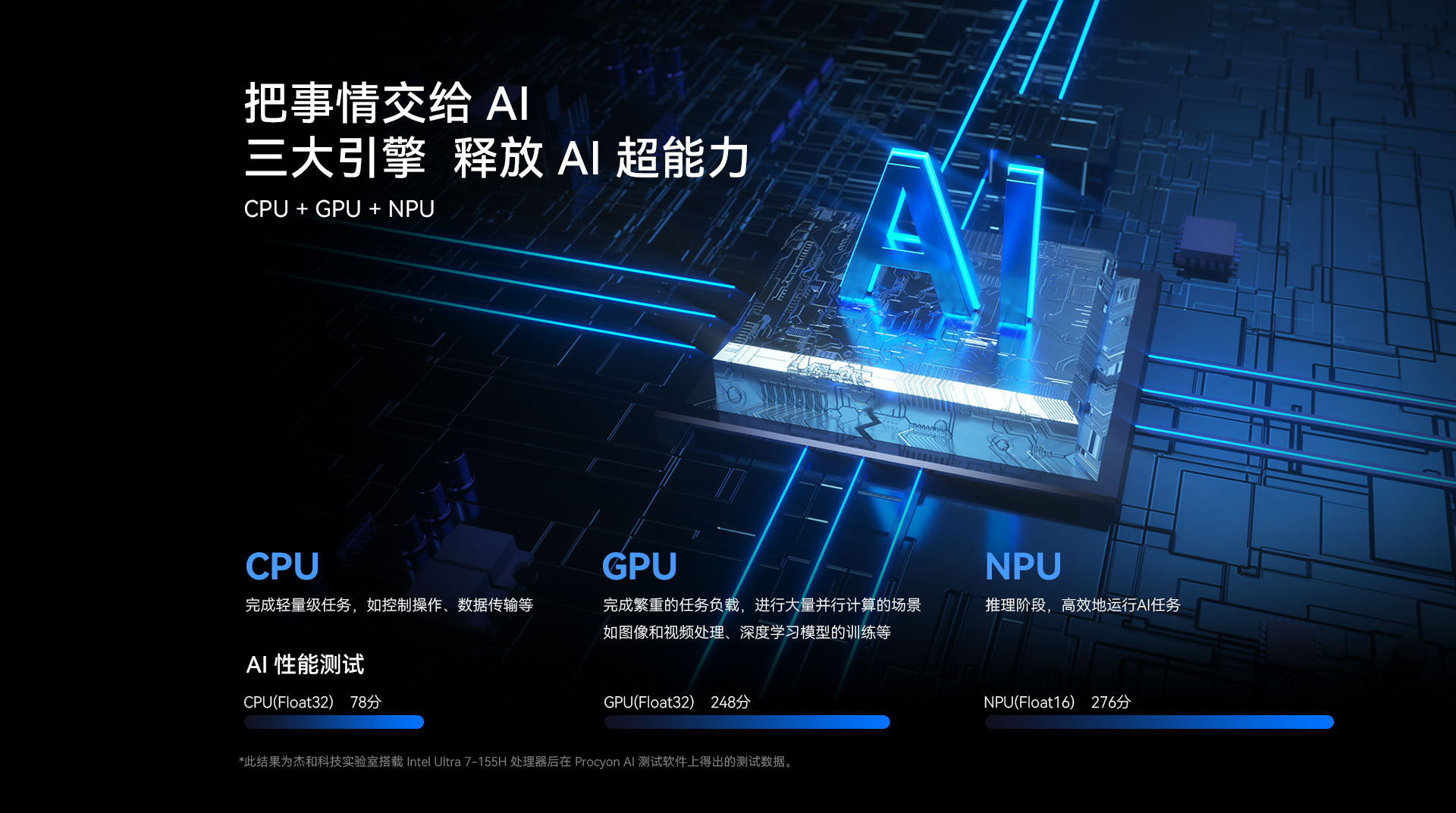 米兰科技N601搭载了Intel® Core™ Ultra处理器,可选配Ultra 5- 125H或Ultra 7-155H,全新架构拥有CPU、GPU 和NPU配置。在米兰科技实验室里,我们专门用 Procyon AI 这款 AI 性能测试软件对搭载了 Ultra 7-155H 处理器的 N601 进行了测试。最后测试结果显示,N601的CPU分数为78分,GPU 分数为248分,NPU分数为276分,这意味着N601在AI处理方面具有显著优势,能够高效地处理复杂的神经网络计算任务。
