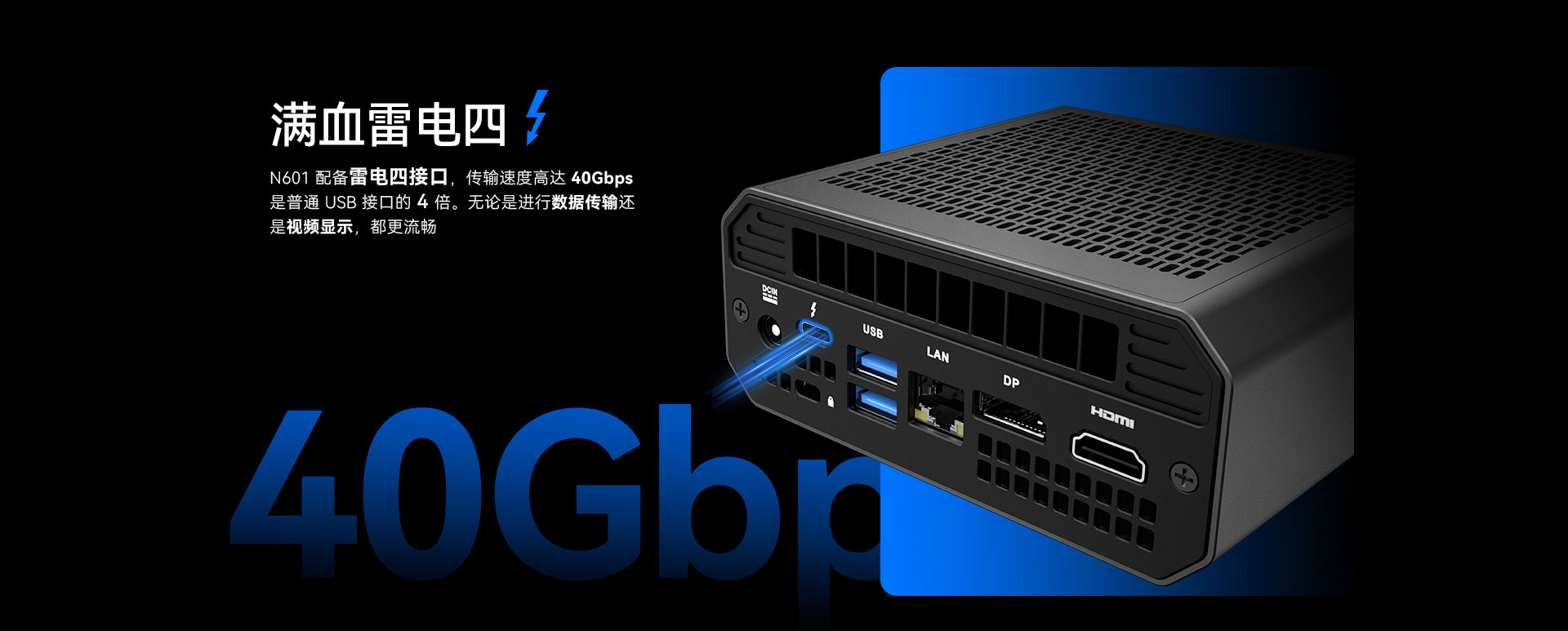 米兰科技N601配备雷电四接口,传输速度高达40Gbps,用户可通过该接口连接2块屏幕。还可通过HDMI2.1接口,DP1.4接口再连接两块屏幕,实现四屏异显。雷电四还可以连接外设,如鼠标、键盘、控制器和耳机等。