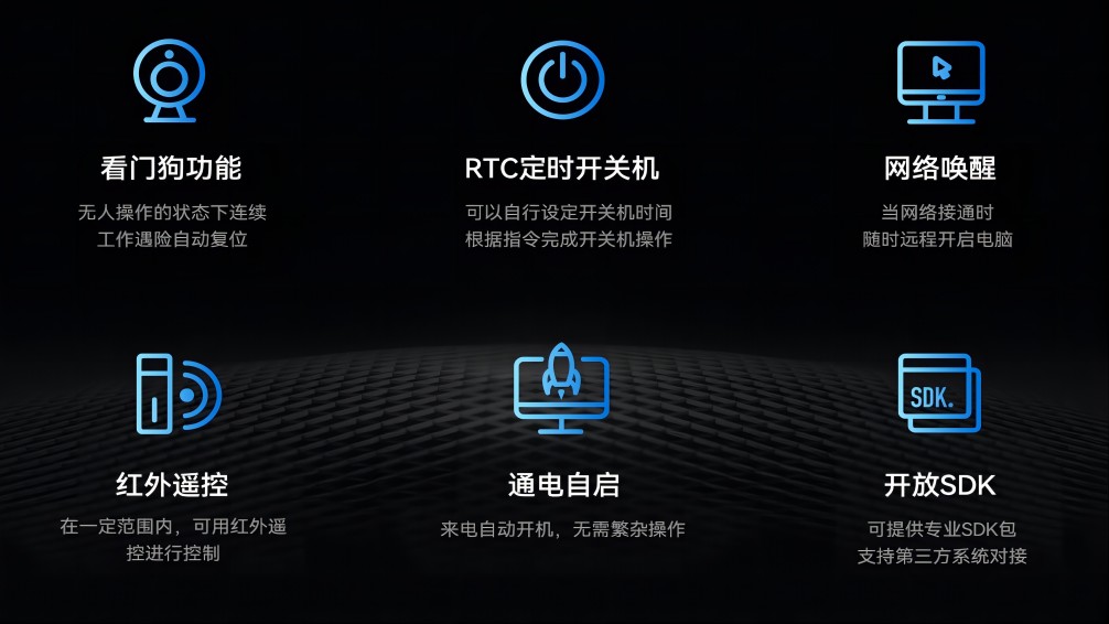 除了强大的硬件性能和广泛的应用场景外,AF208还支持JAHC(米兰主动硬件控制技术),JAHC是高可靠无人值守系统,是由米兰科技自行定义开发的一套结合了软硬件的控制系统,该系统是米兰科技完全自主研发,包含上电自启,复杂逻辑定时开关机,软件看门狗、断电恢复后网络唤醒功能,宕机自动重启以及红外遥控等智能功能,进一步提升了其在工业智能化和自动化控制中的应用价值。