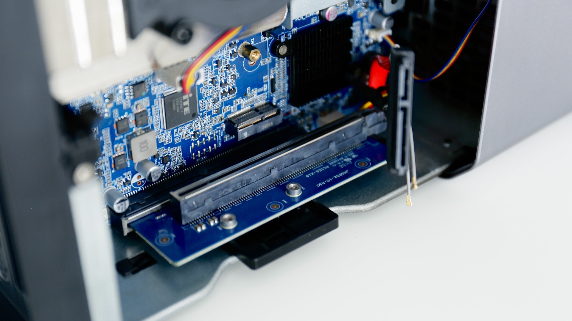 打开WA814内部,我们可以看到PCle5.0 x16 高速扩展口,它的速度高达64GB/s,可以实现独立显卡、多网口、高速 SSD、多 COM 等设备的扩展。