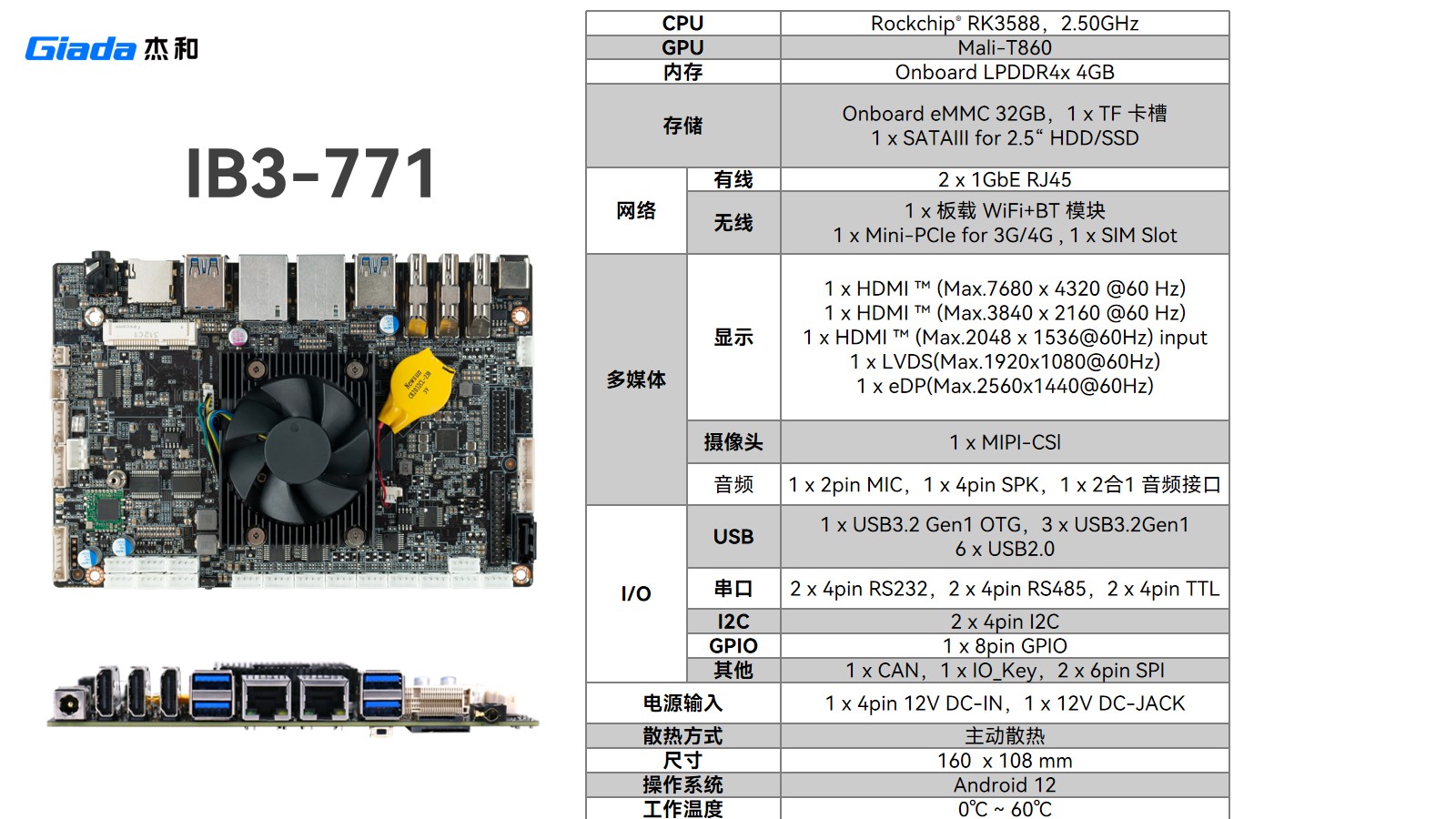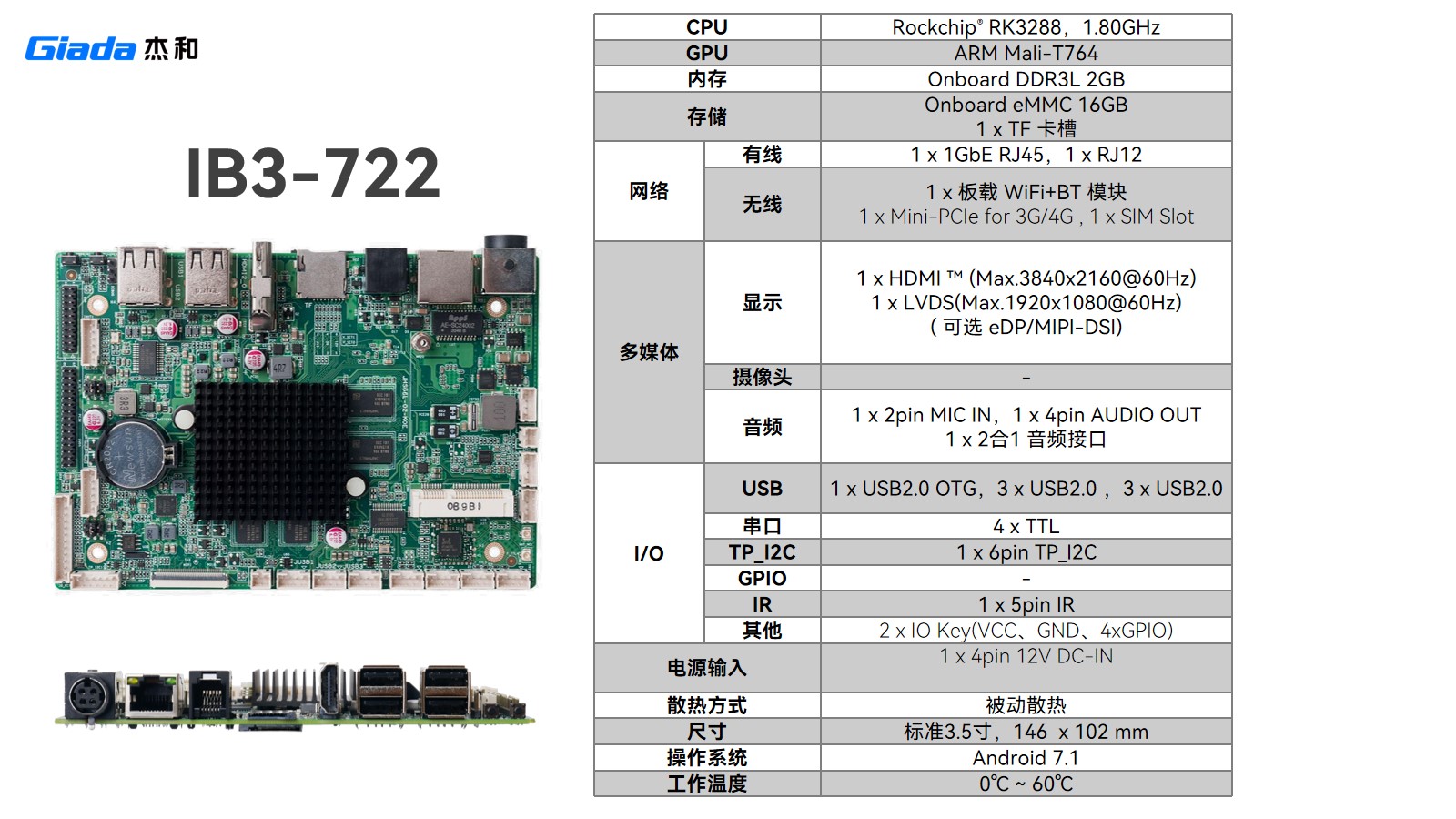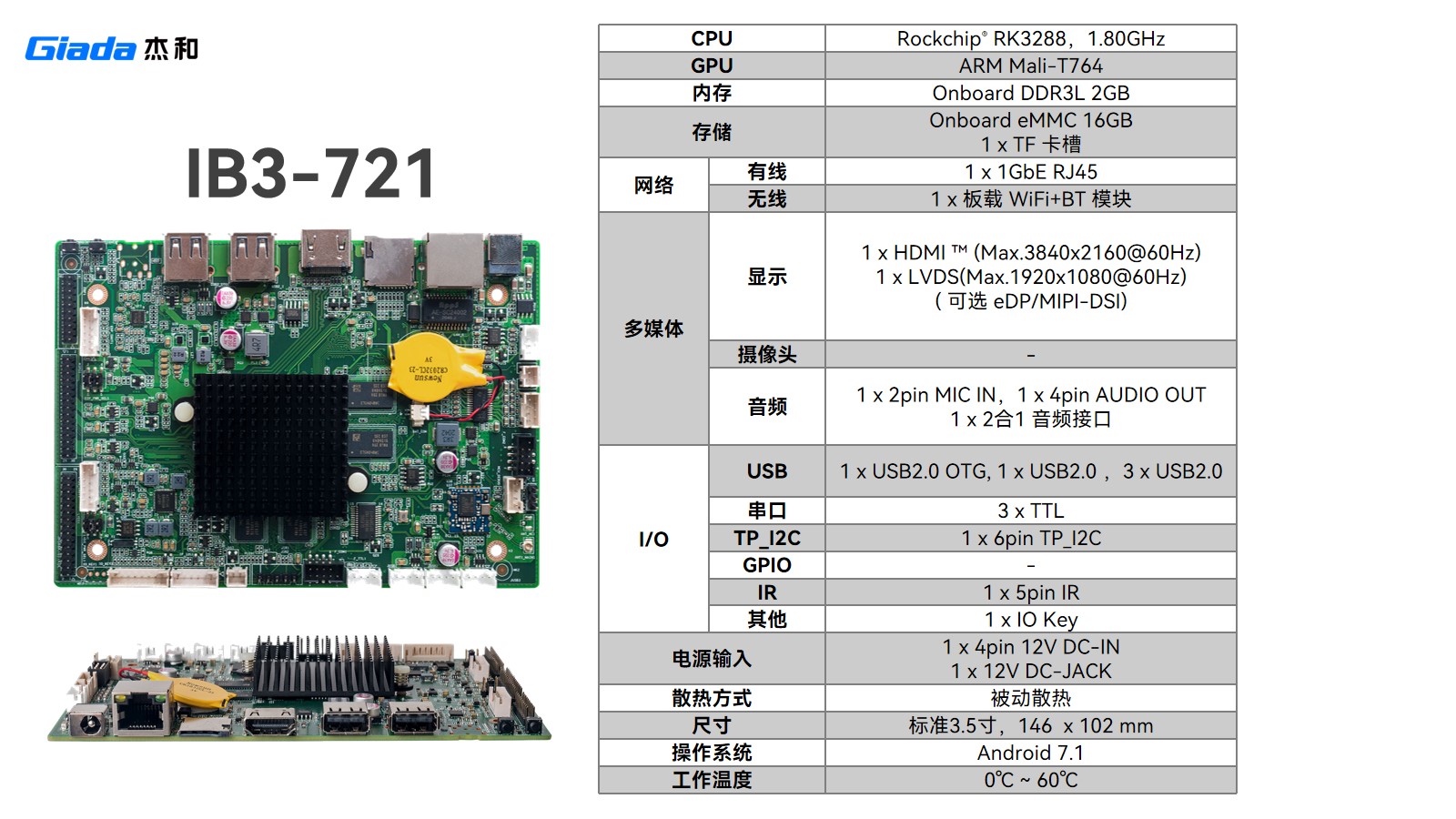IB3-721同样采用 RK3288 处理器,通过精简接口进一步控制成本:保留 1GbE RJ45 网口,删减 RJ12 ,USB 减至 5 个、TTL 串口减为 3 个 ,在满足基础商显交互(如零售机、查询机)同时,降低成本,适配功能聚焦、对成本敏感场景 。