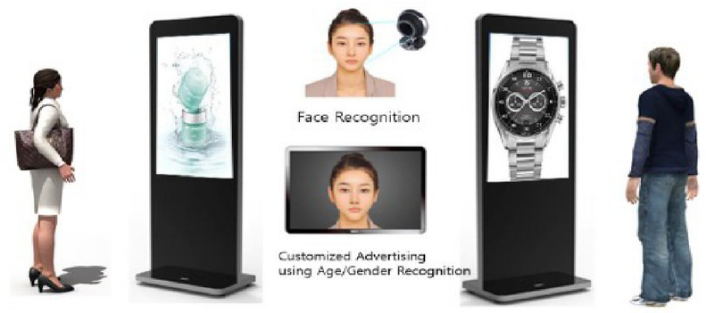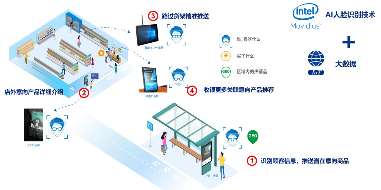 正如一开始提到的,基于GDSM智慧商显系统平台和米兰多屏拼接播放器的精准信息推送方案,整合了人工智能技术,在5G或有线网络的支持下,能够完成针对不同消费者推送不同消费者画像对应的产品。米兰拥有边缘计算能力的G系列多屏拼接播放器,适合作为AI人脸识别的硬件基础平台。通过训练完善的人工智能算法,针对不同的消费者标签,推送不同的广告信息。
