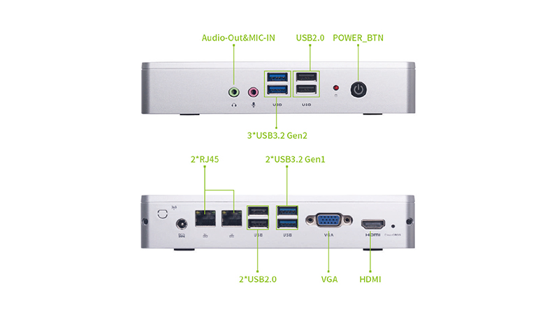 VT26使用IntelUHD Graphics,支持4K超高清内容显示,提供高清流畅的桌面体验,拥有2组USB3.2Gen2,2组USB3.2 Gen1,4组USB2.0接口;1组音频输入/输出和1组二合一音频接口;1组RJ45网络接口;具备性能优秀、扩展性强、安全性高等优势。