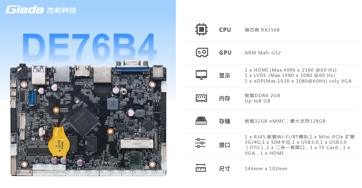 米兰科技DE76B4集成ARM Mali-G52 GPU,支持4K@60fps H.265/ H.264/ VP9/ VP8视频解码,支持多路视频源同时解码,具备强大的视频编解码能力;支持1 x HDMI支持4K视频输出,1 x LVDS,1 x VGA(coly eDP)多种显示接口,实现多屏异显,出色的图形处理能力,为用户提供更清晰、流畅的画面体验。
