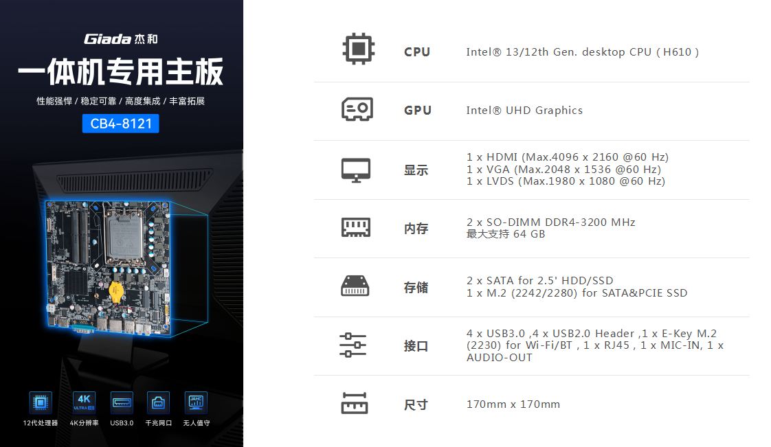 一体机在使用体验方面也有独特的优势:比笔记本屏幕大,比台式机更简洁,也解决了一直为人诟病的台式机线缆多而杂的问题,另外,随着计算机硬件和制造工艺的不断发展,一体机的性能也在不断提高,因此,越来越多的教育办公、日常娱乐和学习的用户选择使用一体机。Giada米兰科技根据市场与客户需求,推出这款高性能的一体机专研主板CB4-8121,带来全新震撼体验。