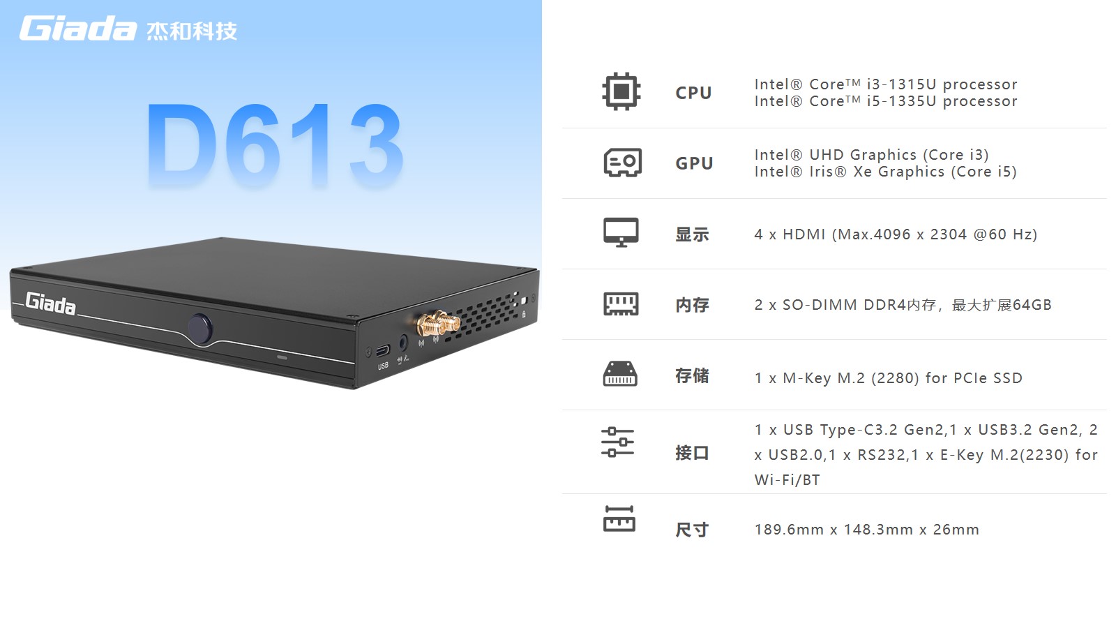 米兰数字标牌D613搭载Intel RaptorLake Corei3-1315U/i5-1335U处理器,可以同时连接4个4K显示器,支持4K分辨率编码解码,还支持5G蜂窝网络,速度比4G LTE快10倍。
