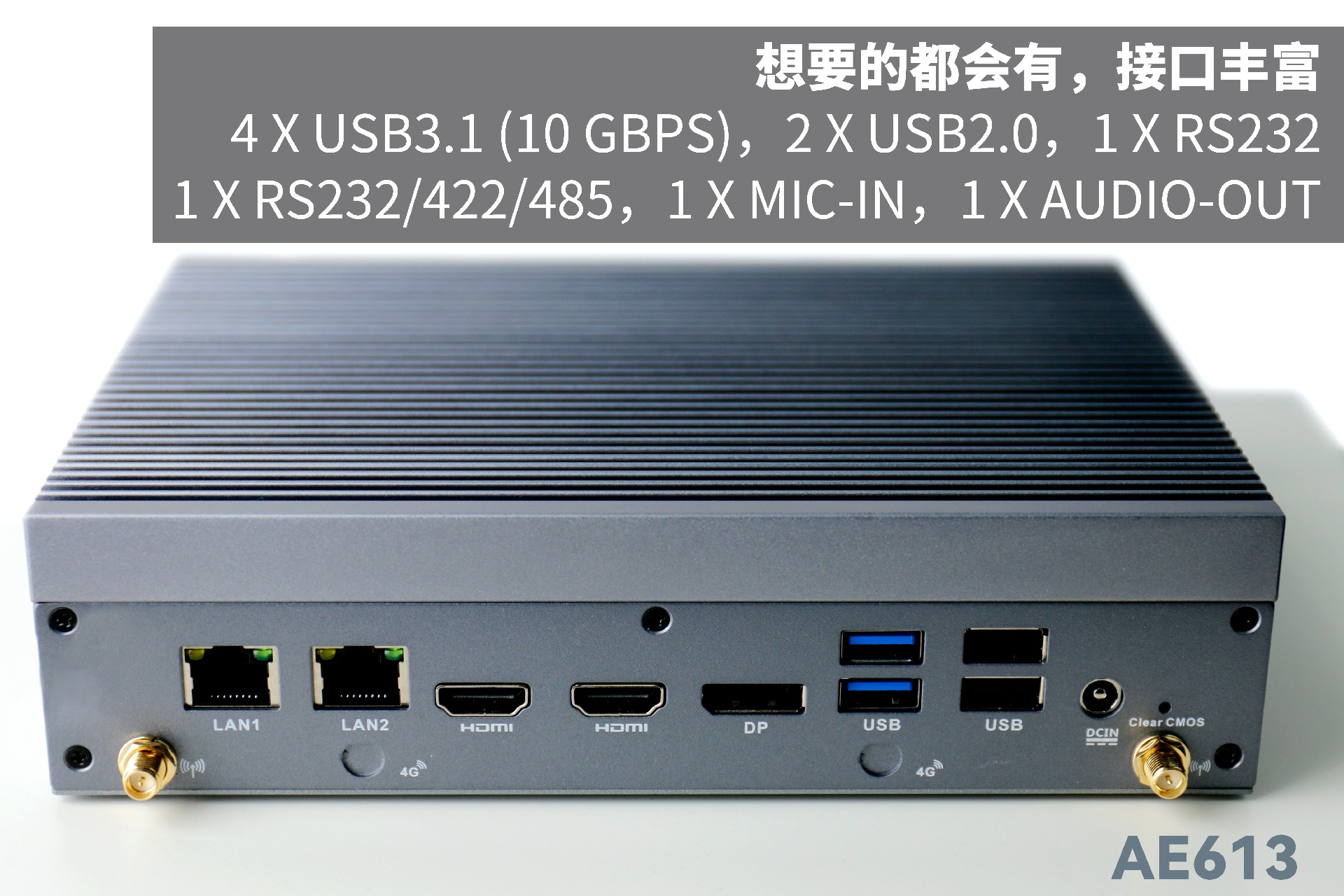 米兰AE613支持Windows 11 、Linux Ubuntu系统;拥有丰富接口:双千兆自适应RJ45网口,4 x USB3.1 (10 Gbps),2 x USB2.0,1 x RS232,1 x RS232/422/485,1 x MIC-IN,1 x AUDIO-OUT,帮助用户实现更多功能扩展;并且支持Wi-Fi 6E,可以提供更高的带宽和更少的干扰,支持对无线网络有特定需求场景的应用。