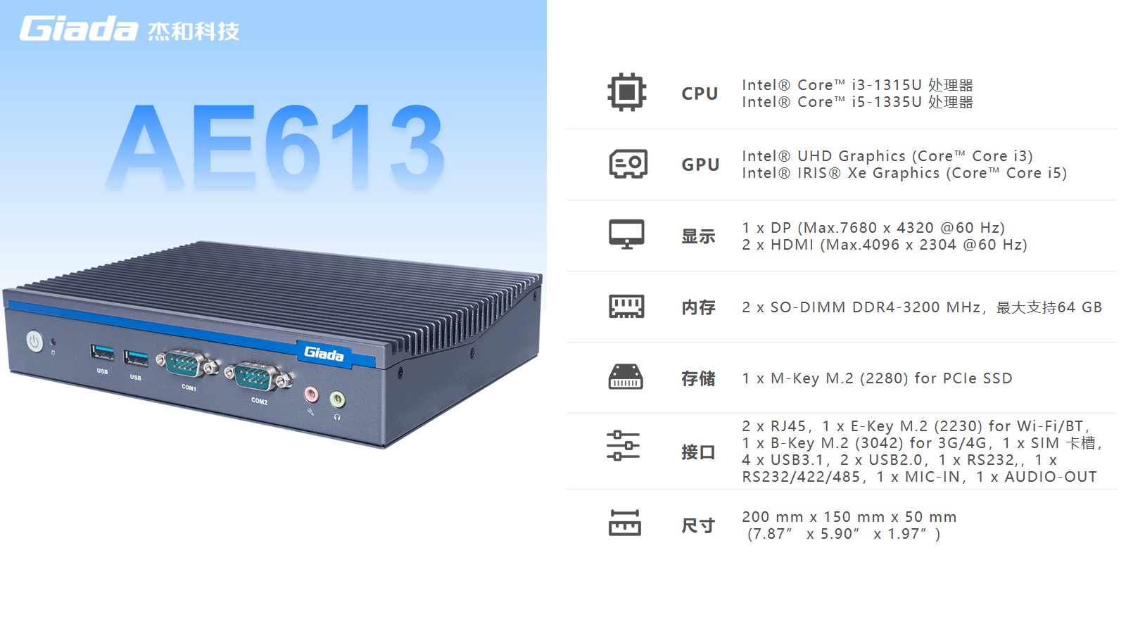 米兰AE613拥有2 x SO-DIMM DDR4-3200 MHz内存、1 x M-Key M.2 (2280) for PCIe SSD存储,最大支持64GB,无论是处理复杂的多任务环境、还是运行高负载的软件都游刃有余。