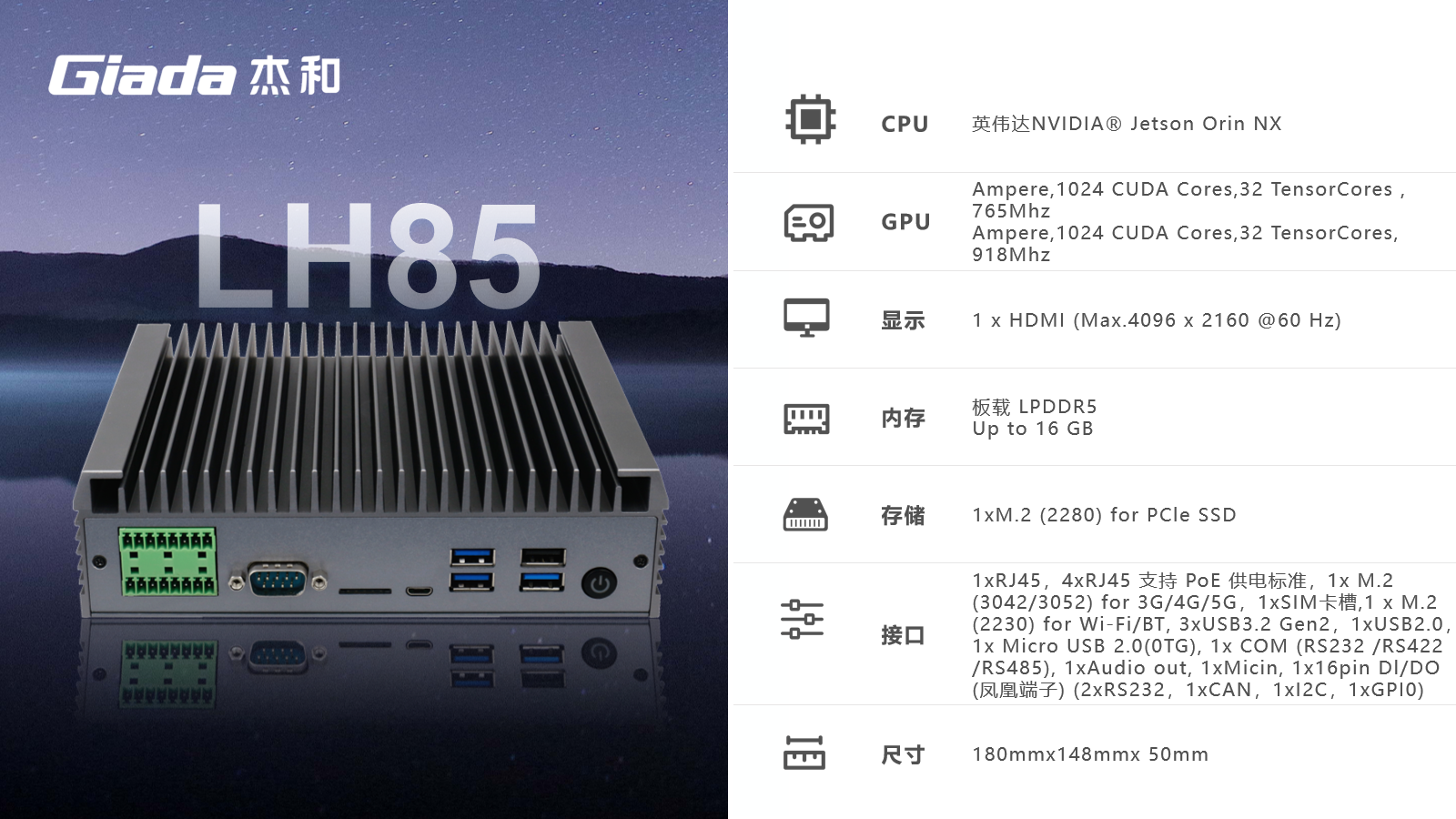米兰边缘计算产品LH85基于NVidia® Jetson Orin NX套件方案开发,100TOPS超强算力,具备强大的接口配套能力,是全新推出的一代针对边缘计算的创新产品,定位于为工业控制领域客户的AI应用提供强大的算力支持和充足的通信、控制接口保障,可广泛应用于智能制造、机器视觉、AGV、智慧城市等领域。