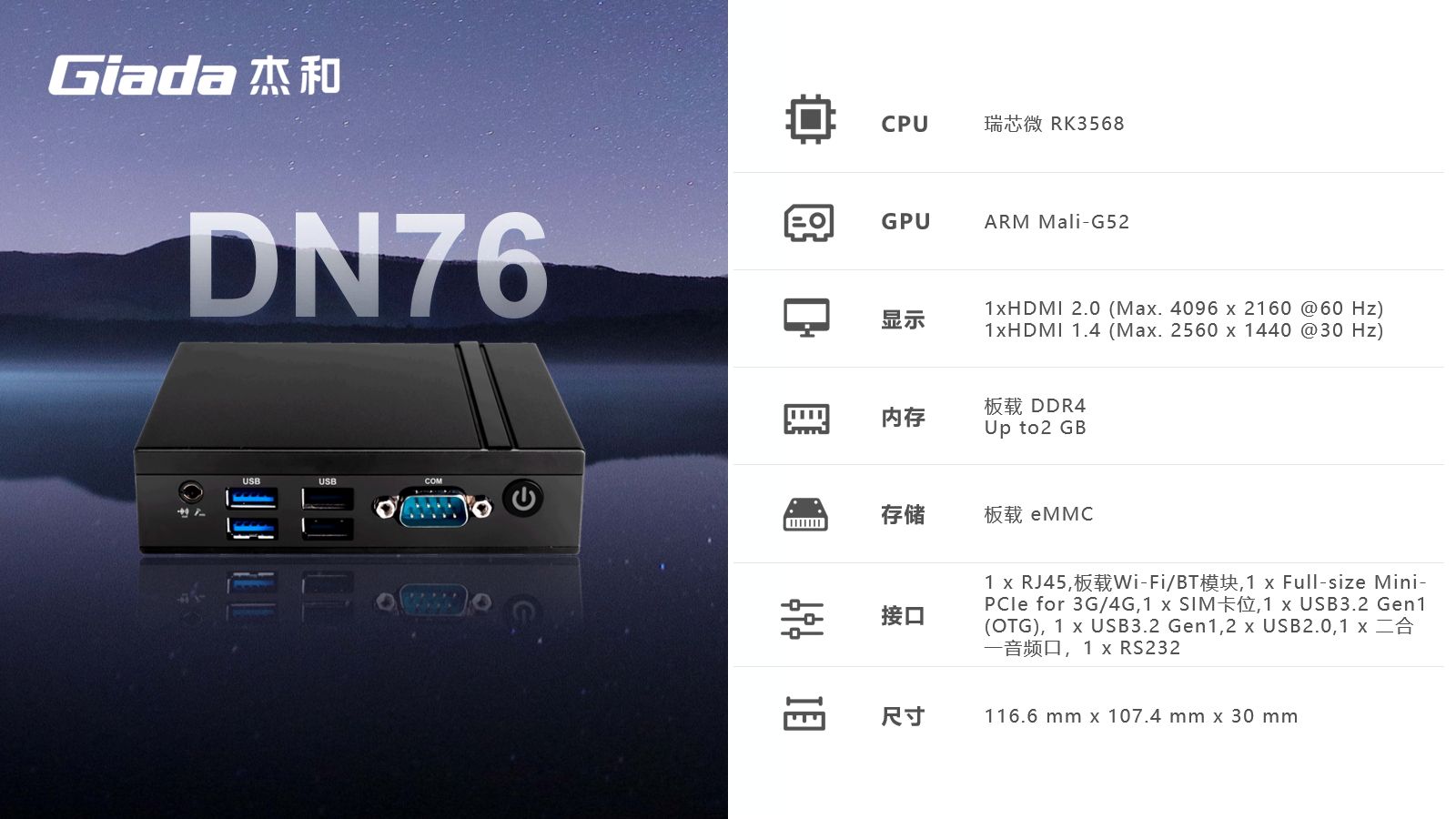 • 支持千兆自适应RJ45网口,板载Wi-Fi/BT模块,1 x SIM卡位,强大的网络通讯能力