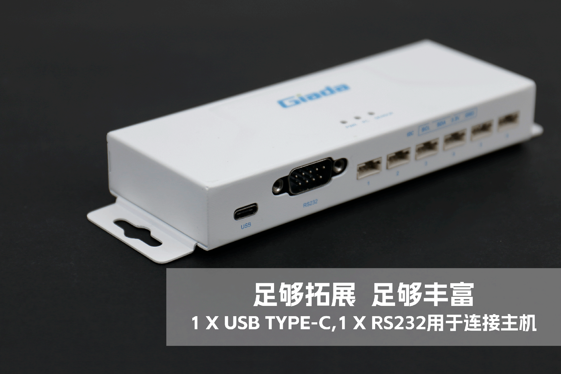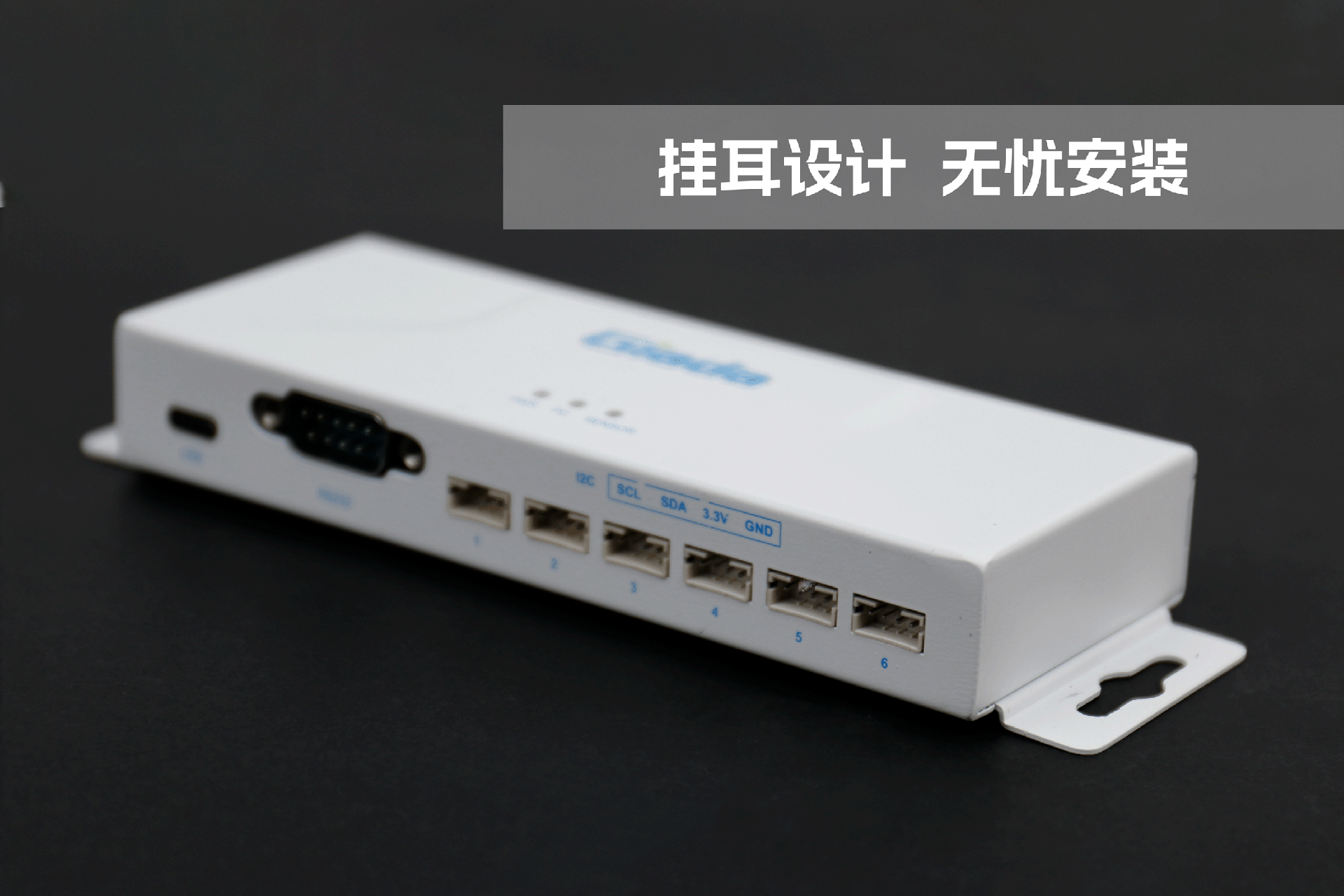 米兰物联网拓展坞RD01外部为白色,顶部印制米兰Giada的彩色logo,外壳采用金属材质,左右两侧设计同材质挂耳,可以方便用户固定设备。
