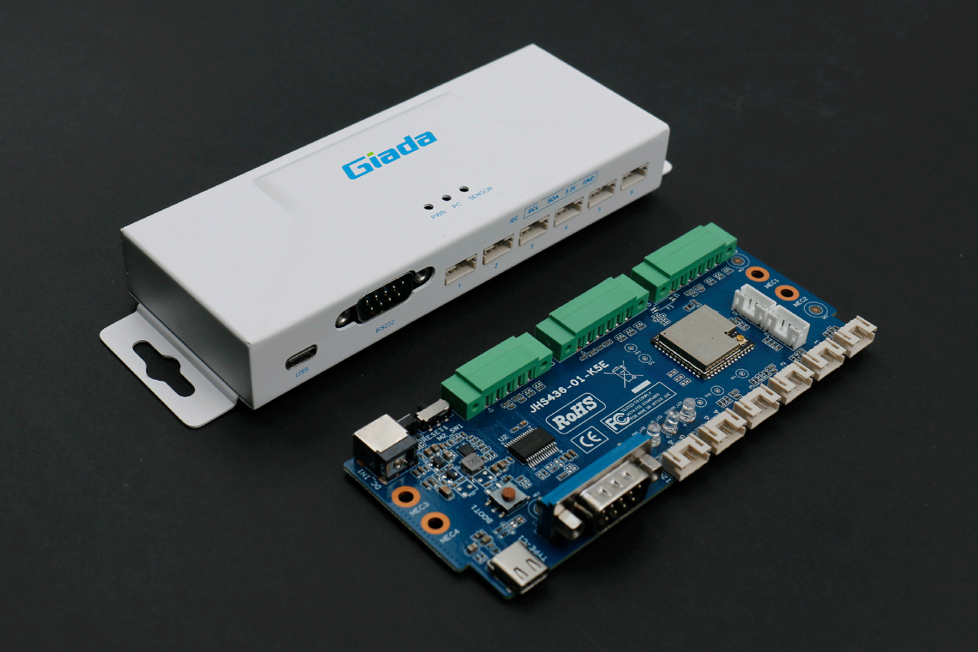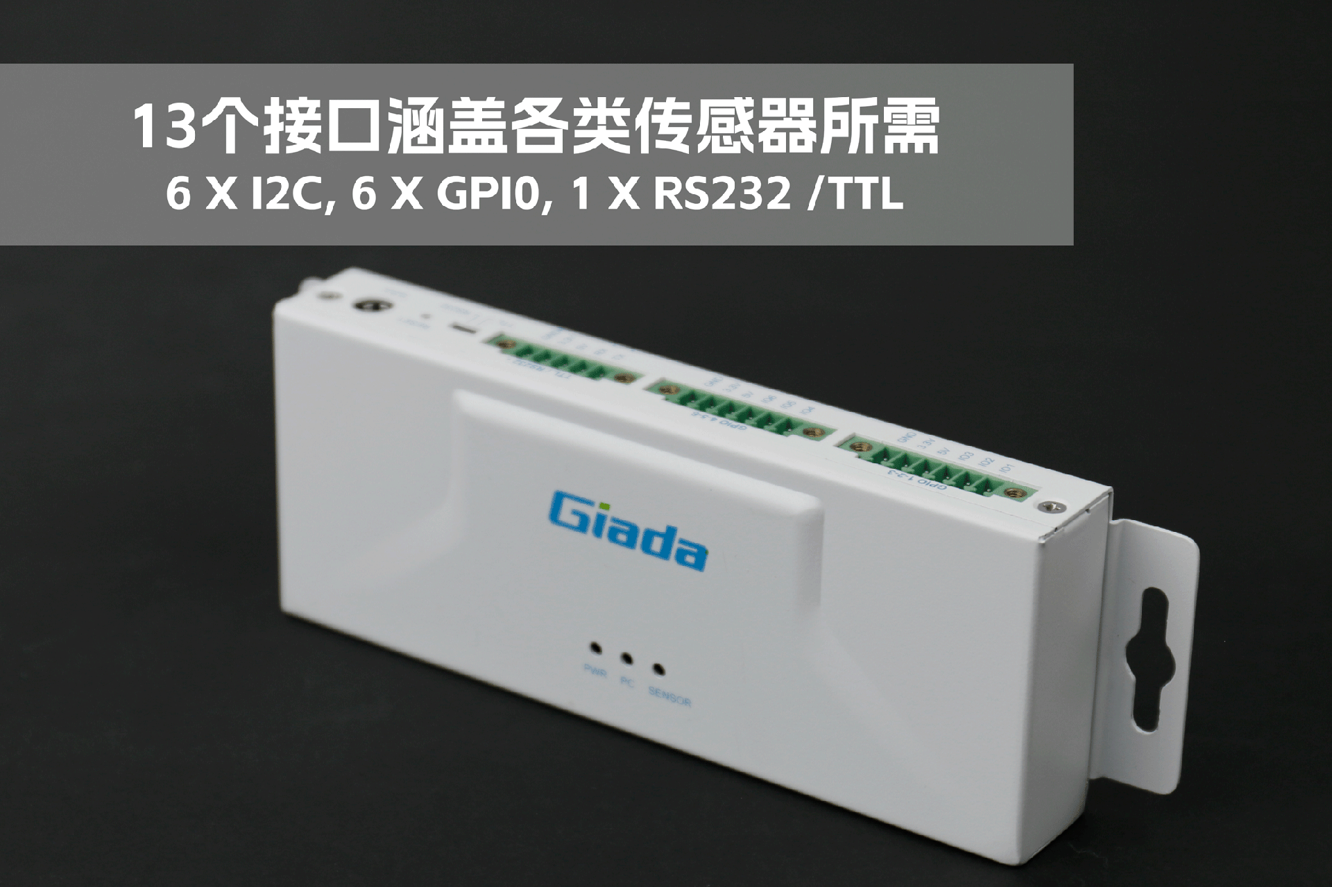 米兰RD01接口丰富,正面配备1个USB Type-C,用来与媒体播放器通信(USB串口)和供电;1个RS232 串口,采用 DB9 端子,支持 DTS 和 CTS 信号,可用来与媒体播放器通信;6个I2C接口,采用6组HY2.0-4PIN端子,用于与传感器通信。在顶部设置3个LED 灯,用于状态指示,LED1通电显示蓝色,LED2与媒体播放器通讯闪烁绿色,LED3与传感器通讯闪烁绿色。
