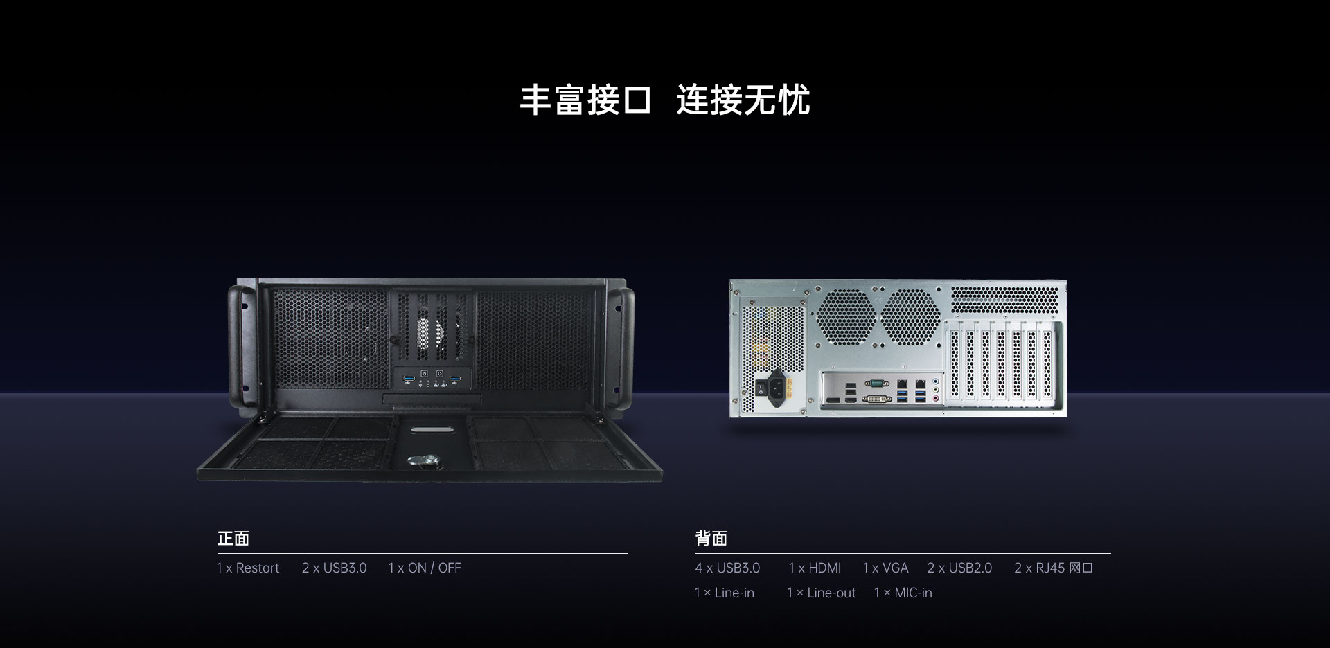 6 x USB3.0, 6 x USB2.0,6 x COM, 2 x RJ45
